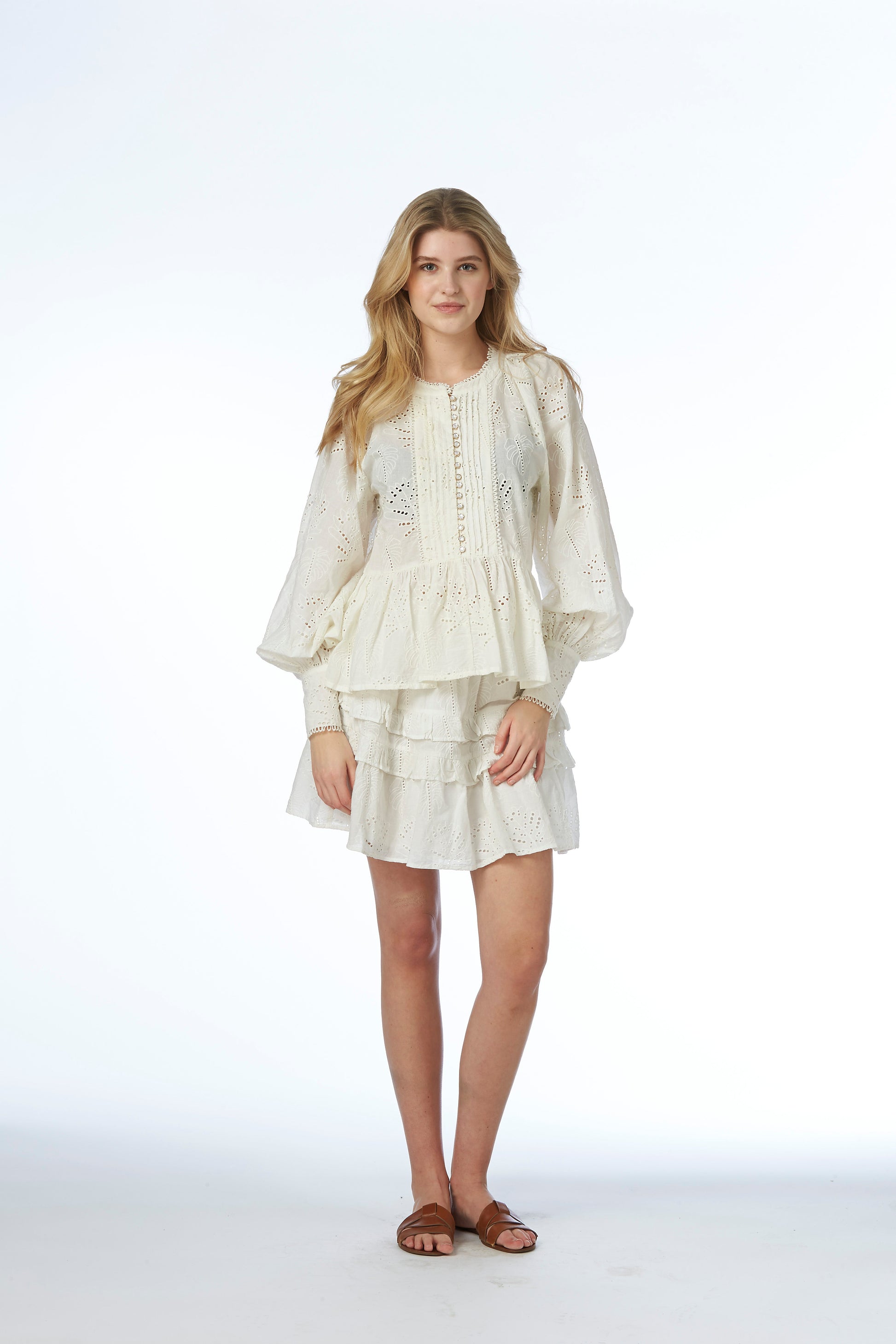 Features: Eyelet embroidery, pearl-accented buttons, voluminous sleeves